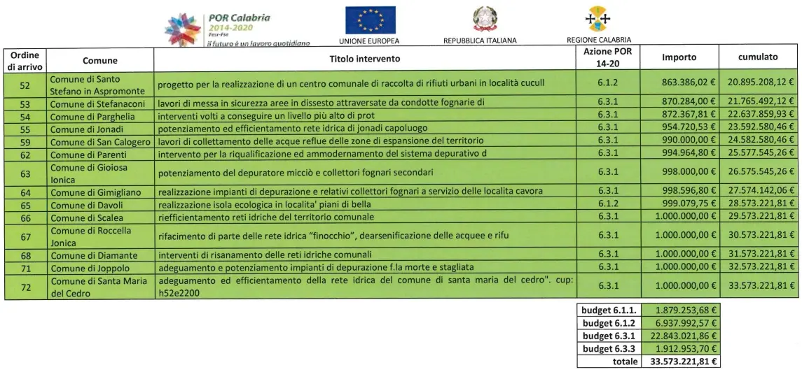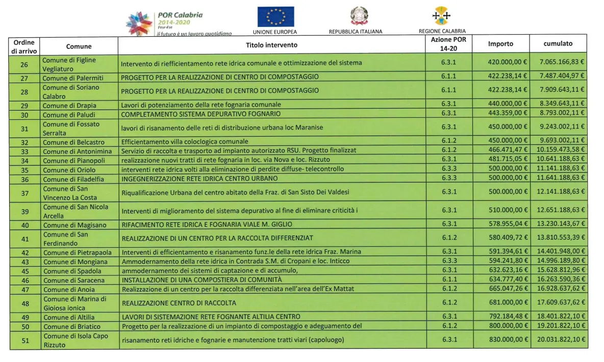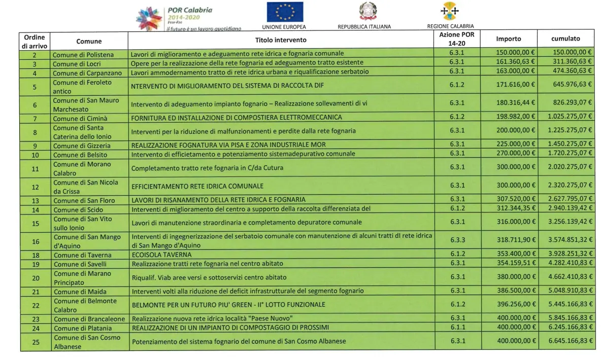- Comune di Parghelia, progetto impianto fognario e depurazione (872mila euro);