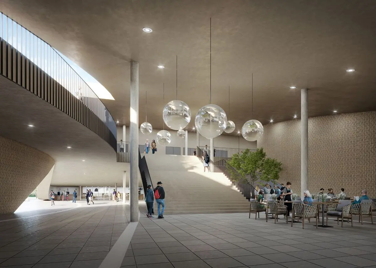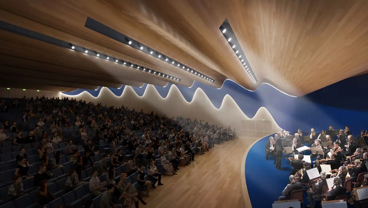 Il Progetto Architettonico. Il Progetto nasce dall’idea di dotare Tropea di un Auditorium di qualità acustica eccellente in grado di ospitare 1500 spettatori e un’area eventi dove ospitare diverse manifestazioni. Una struttura adatta ad una città che ambisce ad assumere il ruolo di capitale del turismo calabrese, avendo già la fama di città Turistica. L’Auditorium contribuirà a trasformare questa parte di città in un vero e proprio hub, aggiungendo la musica e tante altre attività a questo eccezionale collage culturale: un luogo propulsore di attività, di flussi e di scambi interdisciplinari. L’Auditorium creerà un’occasione per promuovere una strategia di rigenerazione complessiva di questa porzione di città conosciuta come “Marina del Vescovado-Area Porto di Tropea” che, nonostante sia stata oggetto in questi ultimi anni di interventi di recupero all’interno del porto e nonostante le numerose attività culturali presenti al suo interno già fortemente attrattive, ancora fatica a diventare sistema e ad esprimere appieno la sua potenziale attrattiva. Il Progetto propone una ricucitura architettonica e urbanistica e l’auditorium con l’anfiteatro saranno il focus di questo progetto di rigenerazione urbana, un attrattore in grado di generare attività, incontri, scambi. Esso trasformerà tutta l’area di Marina del Vescovado e quella intorno al porto in un luogo di incontro su cui si affacceranno tutte le attività culturali. Nella progettazione dell’ingresso all’auditorium la natura unica di Tropea continuerà infatti a dominare lo spettatore che, dopo il simbolico ingresso nelle sue “grotte”, rappresentate dalla curvatura esterna dell’edificio, si ritroverà immerso nel cuore dell’edificio, in uno spazio permeabile e accessibile da più punti, attutito e avvolgente, su cui si affaccerà il foyer e la zona ristoro, spazio che ricorderà per forma e colori il mare e le onde. Un percorso attrezzato permetterà di raggiungere l’Auditorium direttamente dal parcheggio. Questa sistemazione esterna con forme sinuose e piante che seguiranno la forma della pavimentazione includerà elementi di arredo che seguiranno la curvatura dell’edificio e la vegetazione scelta riprenderà la forma delle colline circostanti, creando così un effetto di continuità con la natura. Inoltre, questa sistemazione presenterà elementi architettonici come pergolati curvi nell’area commerciale ed elementi di arredo con curve eleganti. Materiali come il legno, la pietra e il metallo sono utilizzati per conferire alla sistemazione una sensazione organica e fluida. Il nuovo complesso architettonico ripropone le forme fluide dell’architettura organica che caratterizza l’intero impianto progettuale e che costituisce la cifra distintiva dello Studio Schiavello Architects Office.