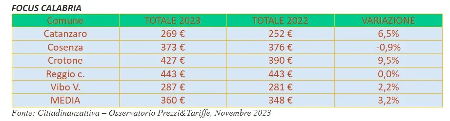 Catanzaro registra una tassa media di 269 euro, 373 euro per Cosenza, 427 euro per Crotone, 443 per Reggio Calabria, 287 euro per Vibo Valentia.