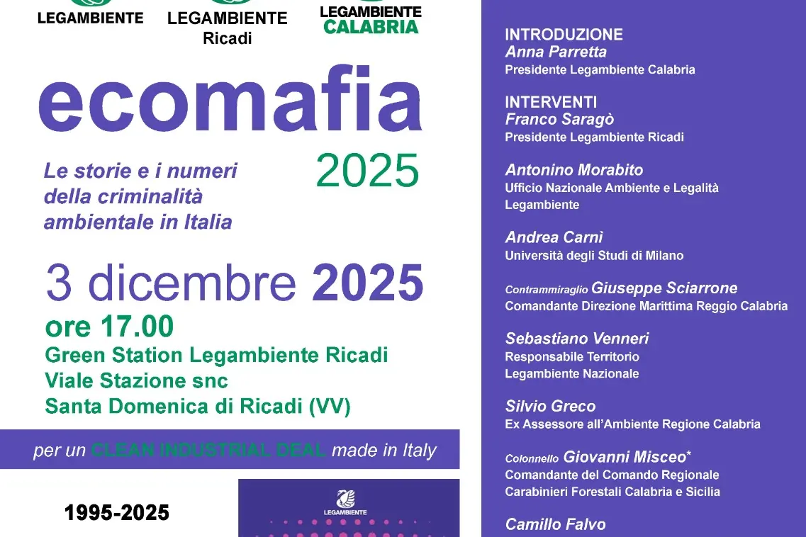 È in programma per mercoledì 3 dicembre alle ore 17, alla Green Station Legambiente Ricadi in via Stazione snc a Santa Domenica, la presentazione del rapporto “Ecomafia 2025”, l’annuale dossier con dati e analisi sulla criminalità ambientale in Italia. L’appuntamento, promosso da Legambiente, riunirà rappresentanti dell’associazione, studiosi, magistrati e vertici delle Forze dell’ordine per fare il punto su fenomeni, numeri e tendenze che riguardano reati contro territorio, acque e ciclo dei rifiuti.