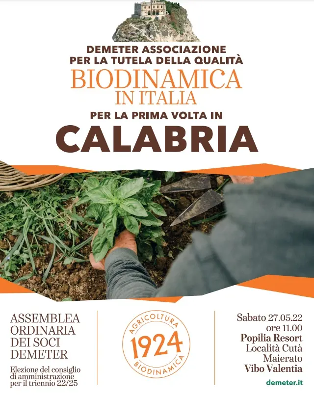Quest’anno l’Assemblea annuale dei produttori agricoli biodinamici dell’Associazione Demeter Italia si terrà, per la prima volta, in Calabria. Avrà luogo il prossimo venerdì 27 maggio a partire dalle ore 11:00 a Maierato, in provincia di Vibo Valentia, presso l’Hotel Popilia Resort. Demeter è l’organizzazione che si occupa di certificare le aziende biodinamiche italiane, aziende già certificate biologiche. La biodinamica è un metodo agricolo praticato in tutto il mondo ed in Italia da un altissimo numero di aziende fondato dal filosofo antropologo, Rudolf Steiner 100 anni fa e si basa su tecniche agricole sostenibili per rendere vitale il terreno e tutelare la biodiversità. [Continua in basso]