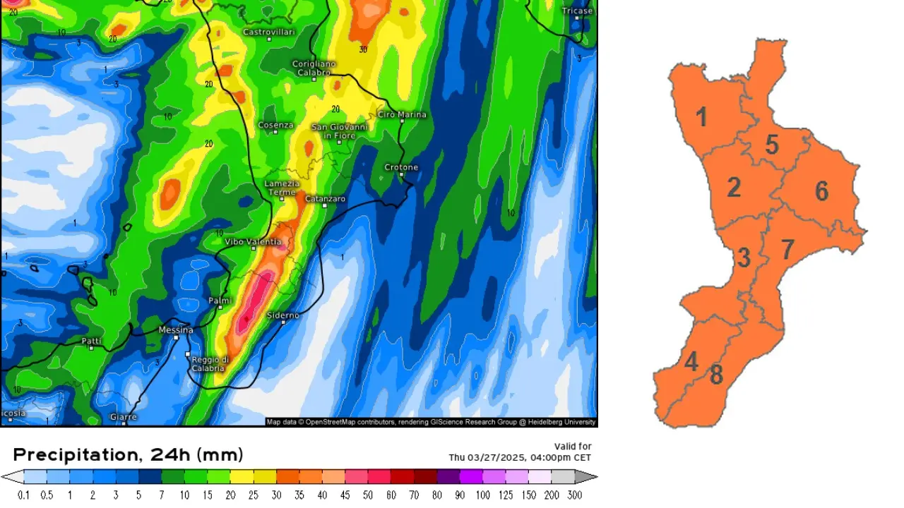 Nelle prossime ore la collocazione del minimo di bassa pressione a ridosso della Campania continuerà a richiamare aria umida da Sud ma soprattutto farà risalire precipitazioni localmente intense verso le Regione. In particolare nel tardo pomeriggio e nella serata sono previste piogge e locali temporali di forte intensità dapprima lungo il versante Tirrenico e successivamente nelle aree interne della Regione e lungo il versante jonico, con accumuli che potranno essere anche abbondanti. In particolare le aree più a rischio forti piogge saranno quelle interne Reggine, Vibonesi e Catanzaresi ma con precipitazioni abbondanti anche lungo la fascia Jonica Reggina, Catanzarese e sull’alto Tirreno Cosentino. In merito a ciò la protezione civile insieme al centro funzionale multirischi Arpacal ha emesso un’allerta meteo arancione per l’intero territorio Regionale.