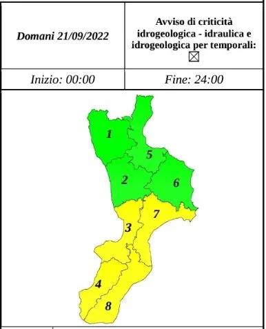 A pochissimi giorni dall’equinozio che ci traghetterà in autunno, si abbassano le temperature e arriva il fresco. Ma non solo, nei prossimi giorni sono attese anche piogge e possibili temporali. Con il bollettino meteo diffuso quest’oggi, il dipartimento di Protezione civile della Calabria ha diramato l’allerta gialla per la giornata di domani.