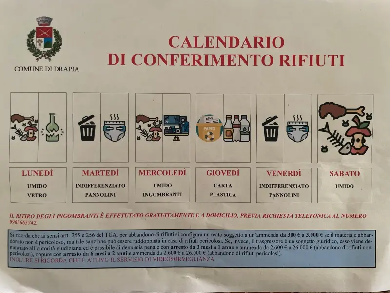 Sono in corso da mercoledì 16 agosto (e si protrarranno fino al 21 agosto) le operazioni di distribuzione, per ciascuna frazione di Drapia, del calendario e dei sacchetti destinati alla raccolta differenziata. Quanti su Caria, Gasponi e Drapia hanno già provveduto al ritiro dei rotoli programmato dal Comune, hanno immediatamente notato una serie di cambiamenti, tra colore dei sacchetti e volantino settimanale del “porta a porta”, che hanno sollevato un po’ di perplessità. Mentre in precedenza il colore dei sacchetti rendeva facilmente distinguibile il mastello da esporre (sacco per il vetro di colore verde; indifferenziato nero; umido bianco; carta giallo e plastica azzurro), ora è l’assenza di colori che sembra mettere in seria difficoltà la popolazione. Tanto più che gli stessi colori risultano essere “spariti” anche dal nuovo calendario di ritiro appena distribuito. «Riteniamo poco chiaro il volantino contenente il calendario relativo al conferimento dei rifiuti – hanno fatto sapere diversi residenti -, dal momento che il fondo di ciascun riquadro è bianco e non più del colore relativo al sacco da utilizzare».