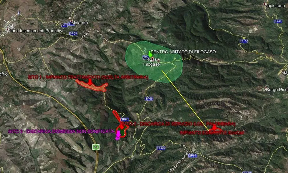 La prima, quella che dovrebbe ospitare la piattaforma per il trattamento dei rifiuti Rus e Forsu (mai votata dall’Ato), sorge nel cuore di una zona agricola coltivata ad uliveti con certificazione biologica e circondata da pascoli ricadenti, tra l’altro, nel disciplinare di produzione della Dop del Pecorino del Monte Poro. Il sito in questione (foto a lato) è immediatamente a ridosso di un’area boscata di macchia mediterranea e bosco ceduo e si trova a circa 2 chilometri in linea d’aria dall’abitato di Filogaso tanto che è stato suggerito uno studio dei venti per scongiurare “impatti odorigeni” sul paese. In più, la strada d’accesso è interdetta al traffico per rischio frana e le aree immediatamente prossime alla particella individuata sono segnate in rosso nella mappa del rischio idraulico Pai 2016 (foto in basso).