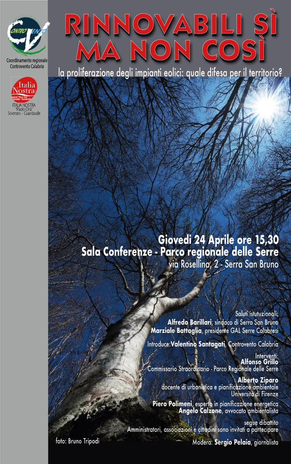 Si svolgerà il prossimo 24 aprile nella sala conferenze del Parco Nazionale delle Serre un convegno – dibattito dal titolo ”Rinnovabili si ma non così” che sarà introdotto dai saluti istituzionali del sindaco di Serra San Bruno, Alfredo Barillari e del presidente del Gal Serre Calabresi Marzaiale Battaglia a cui seguiranno gli interventi di: Alfonso Grillo, commissario del Parco delle Serre, Alberto Ziparo, docente di urbanistica e pianificazione ambientale all’Università di Firenze, Angelo Calzone, avvocato ambientalista già delegato regionale Wwf, Piero Polimeni, esperto in pianificazione energetica. A moderare e introdurre l’evento Valentino Santagati (Controvento Calabria) ed il giornalista Sergio Pelaia.