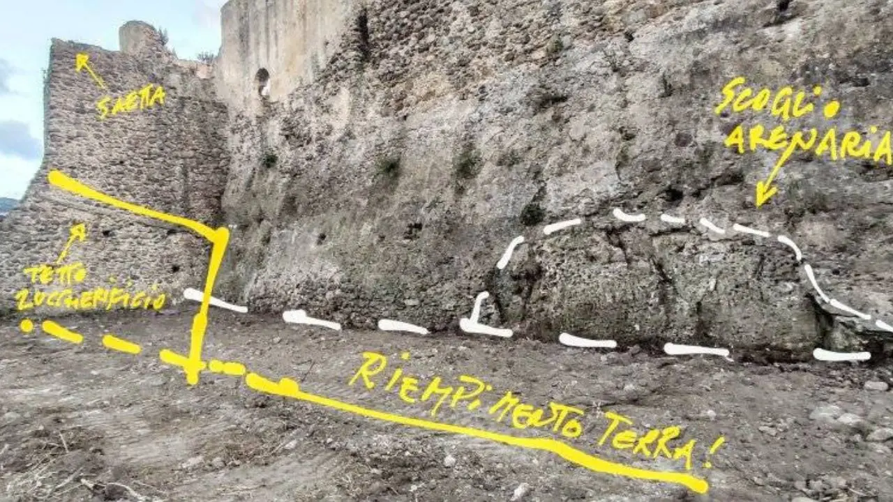 Tuttavia, la cinta muraria nord «fa emergere la suggestiva presenza di una grande roccia di arenaria sulla quale venne costruito il Castello agli inizi del 1300. Questa roccia, con i suoi segni levigati dall’azione del mare e la presenza di fossili e ciottoli, rivela che il Castello è stato costruito su un isolotto emerso in un contesto paesaggistico completamente diverso dall’attuale». Per Montesanti, «sarebbe utile studiarne l’origine, la conformazione, seguirne l’andamento in estensione e profondità, così da comprendere la sua datazione e, perché no?, scoprire – se ve ne sono – tracce di uso più antiche di quelle legate al castello. Quello scoglio arenarico potrebbe offrirci la possibilità di scoprire anche i segni di strutture fondative di epoca greca o romana? Su quell’isolotto vi era un faro, un tempio, sui resti dei quali venne impostato il Castello angioino, come scrivevano gli storici antichi?»