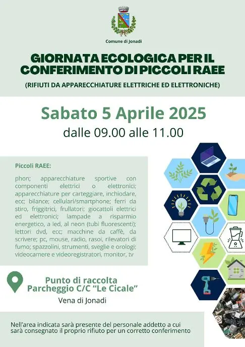 “Perché buttarlo per strada? Portalo a noi!”. Questo il titolo dell’iniziativa ecologica promossa dall’amministrazione comunale di Jonadi. L’appuntamento è per sabato 5 aprile, dalle 9 alle 11, frangente della giornata in cui l’Ente territoriale propone una raccolta straordinaria dei piccoli Raee, rifiuti da apparecchiature elettriche ed elettroniche. Nell’occasione i cittadini avranno la possibilità di conferire questa tipologia di spazzatura presso la postazione che sarà realizzata all’interno del parcheggio del Centro Commerciale “Le Cicale”, a Vena di Jonadi. Nell’area di raccolta sarà presente anche del personale addetto al ritiro, pronto a garantire un conferimento sicuro e conforme alle normative. «L’iniziativa – si sottolinea al riguardo dalla sede municipale – nasce con l’obiettivo di agevolare i cittadini nello smaltimento corretto di questi rifiuti, già previsto su prenotazione, ma ora reso ancora più accessibile grazie a questa giornata di raccolta, pensata per velocizzare il servizio, ottimizzare la gestione dei conferimenti e contrastare il fenomeno dell’abbandono sul territorio. I Raee – si aggiunge – comprendono oggetti di uso quotidiano come cellulari, pc, tv, lampade a led, rasoi elettrici, piccoli elettrodomestici, giocattoli elettronici, bilance, phon, radio, strumenti musicali, videoregistratori, sveglie e molto altro.