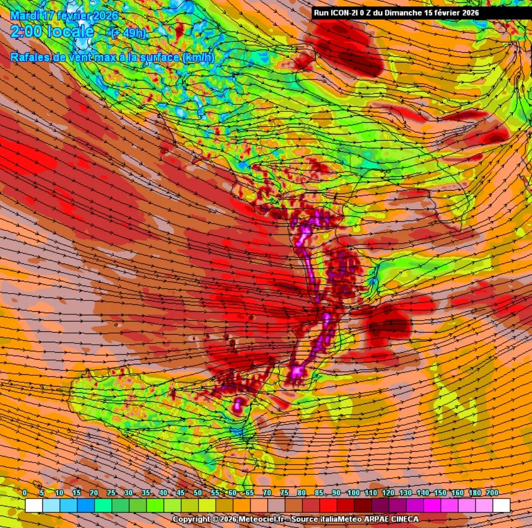 Ad accompagnare ciò sarà nuovamente un forte rinforzo dei venti: sono previste infatti nuove raffiche di tempesta sulle aree Tirreniche ma soprattutto nelle aree interne e joniche soggette ai venti di caduta dove potranno nuovamente raggiungere picchi fino ai 120-130 km/h specie su Catanzarese e Reggino. Di conseguenza si avrà un nuovo aumento del moto ondoso marino lungo le coste tirreniche con mari che risulteranno nuovamente molto mossi o agitati su tutti i litorali.