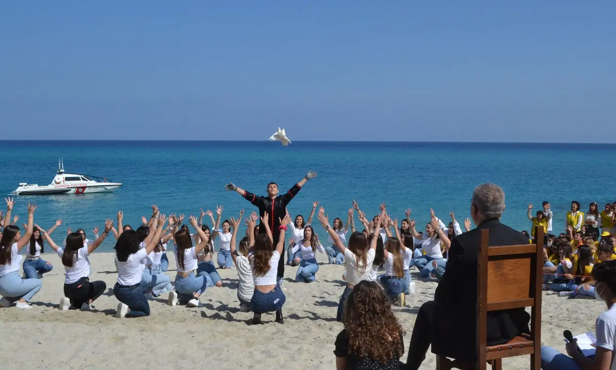 Sulla splendida spiaggia delle “Roccette”, con lo sfondo di un mare azzurro solcato dalla motovedetta della Capitaneria di Porto, il presidente del circolo Legambiente Ricadi Franco Saragò, il sindaco di Tropea Giovanni Macrì e il comandante C.F. della Capitaneria di porto di Vibo Marina Agazio Tedesco hanno sensibilizzato gli studenti sulle tematiche ambientali e sul dovere, che tutti abbiamo, di salvaguardare l’ambiente a partire da piccoli gesti quotidiani. Il dirigente scolastico Nicolantonio Cutuli, ha ringraziato tutti i presenti e in particolare monsignor Nostro che ha incontrato gli studenti. A portare i saluti dei ragazzi sono stati Simone Incoronato e Anna De Luca i quali, nel presentare l’iniziativa hanno evidenziato l’essenza delle attività messe in campo dalla scuola per la giornata. Tutela dell’ambiente e custodia del creato per rispondere alle guerre con atti di pace e a tutto ciò che deturpa la natura. «Siamo qui con le nostre canzoni e i nostri gesti per chiamare la pace» hanno aggiunto gli alunni, invitando il vescovo a seguirli sulla spiaggia.