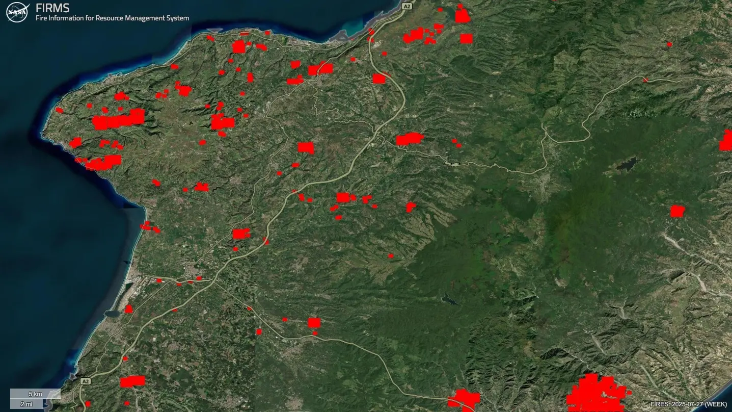 La foto di Firms (Fire information for resource management system) della Nasa mostra una Calabria che brucia in un Sud flagellato dagli incendi, puntellato di rosso dai roghi che, nell’ultima settimana, hanno divorato decine di ettari del territorio. In Sicilia e Puglia la situazione appare, stando alle immagini satellitari, altrettanto drammatica (nel Salento forse ancora di più).