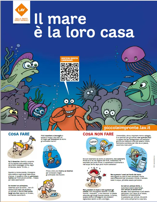 Tutti i materiali recano un QR code attraverso il quale si può accedere alla pagina web dedicata all’iniziativa dove si troveranno non solo utili consigli, ma anche un podcast e un pdf da scaricare con una storia da leggere o ascoltare sotto l’ombrellone, diretta proprio a bambini e bambine. «L’abitudine di catturare piccoli animali sulla spiaggia è purtroppo diffusa – spiegano dalla Lav – e sia i bambini che le loro famiglie sottovalutano il maltrattamento che quegli stessi animali subiscono. Cambiamenti di temperatura, manipolazione, urti, carenza di ossigeno provocano gravi sofferenze negli animali marini. Considerazioni simili si possono fare per gli animali di terra che popolano la spiaggia e la zona immediatamente prossima, senza contare il potenziale danno ambientale che si può produrre».
