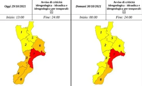 Per il pomeriggio di oggi e fino a stasera, l’allerta è di colore rosso per la fascia ionica centrale della Calabria, tra le province di Crotone e Catanzaro; mentre è allerta arancione nelle province di Vibo Valentia e Reggio Calabria e nel lametino e ionica cosentina. Per domani, invece, permane l’allerta rossa per la ionica centrale, mentre in arancione resta solo la ionica reggina e il resto della regione sarà in giallo. Il Comune di Catanzaro ha già deciso di chiudere le scuole per la giornata di domani.