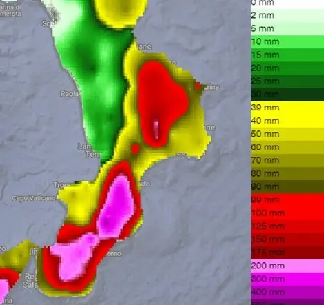 Negli ultimi due giorni, è la stazione meteorologica di Cassari di Nardodipace, provincia di Vibo Valentia, ad aver registrato la precipitazione cumulata più elevata in Calabria: in meno di 48 ore (dalle 17:00 del 24 alle 10:30 del 26 ottobre) sono stati misurati 451.6 mm. Seguono Chiaravalle Centrale ( 358.2 mm), Mongiana (350.4 mm), Antonimina Canolo Nuovo (314.4 mm), Serra San Bruno (259.2 mm), Fabrizia (257.8 mm), Santa Caterina dello Ionio (255.4 mm), Palermiti (241.2 mm). [Continua in basso]