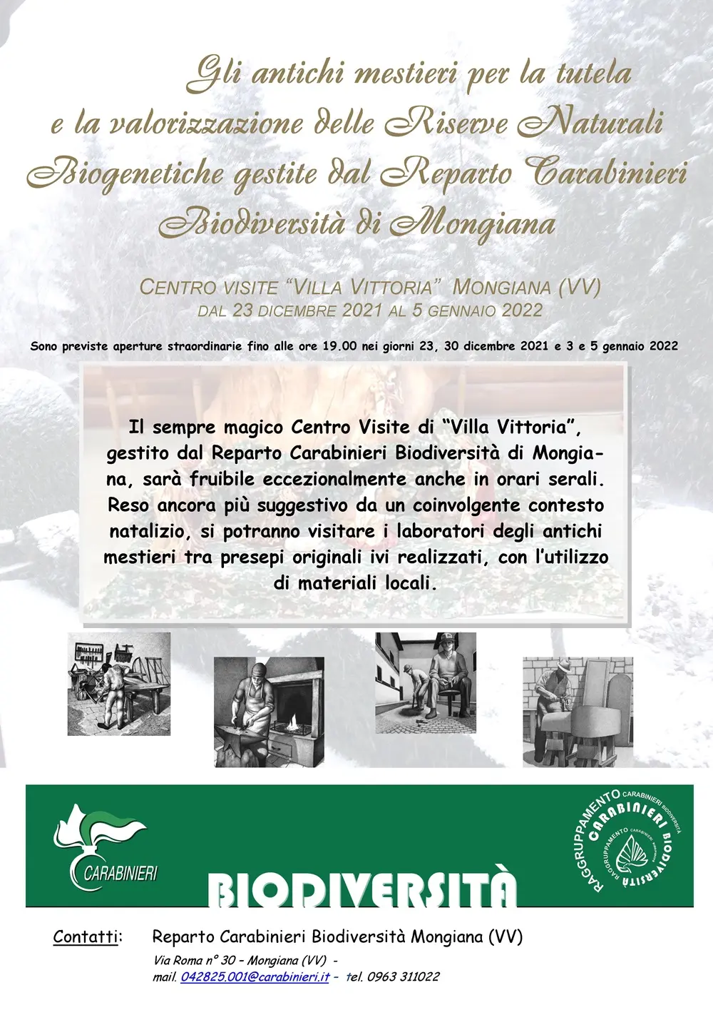 Il Reparto Carabinieri Biodiversità di Mongiana ha predisposto, per le festività natalizie, delle aperture straordinarie del centro visite di “Villa Vittoria” tese a promuovere la conoscenza e la valorizzazione degli antichi mestieri. La finalità dell’iniziativa è quella di promuovere ed esaltare l’importanza e l’operato dell’uomo nella tutela della biodiversità ed in particolare, delle due riserve naturalistiche biogenetiche del Reparto.