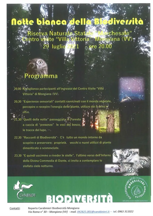 Cresce l’attesa per la “Notte Bianca della Biodiversità”, manifestazione organizzata dal Raggruppamento Carabinieri Biodiversità di Roma e dedicata alla scoperta delle Riserve Naturali e delle specie animali notturne all’interno dei 28 Reparti Carabinieri Biodiversità, con un’apertura straordinaria in orario serale. Nella provincia di Vibo Valentia, il Reparto Carabinieri Biodiversità di Mongiana (VV) ha previsto l’apertura della Riserva naturale biogenetica “Marchesale” il 29 luglio prossimo, secondo il programma appresso specificato.
