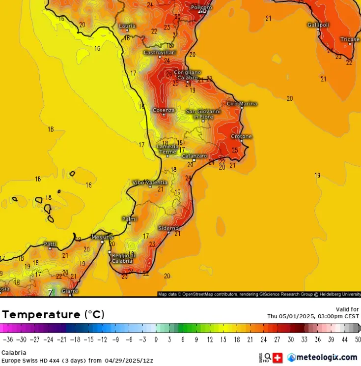 Come anticipato dunque l’alta pressione prenderà il sopravvento del Sud Italia e della Calabria, apportando un miglioramento delle condizioni meteorologiche ovunque. In particolare lo sguardo è fisso verso la giornata del 1° maggio, festa dei lavoratori, dove la tradizione vuole che si facciano gite fuori porte sia nelle aree costiere che nelle aree montuose. Quest’anno questa tradizione potrà essere rispettata grazie al bel tempo che interesserà l’intero territorio: in particolare si avranno condizioni meteorologiche stabili ovunque con cieli che si manterranno sereni o poco nuvolosi soprattutto nelle aree interne. Qualche nube innocua la si potrà trovare invece lungo le aree costiere tra Pizzo, Tropea e aree limitrofe, anche se comunque non sono previste nessun tipo di precipitazioni.