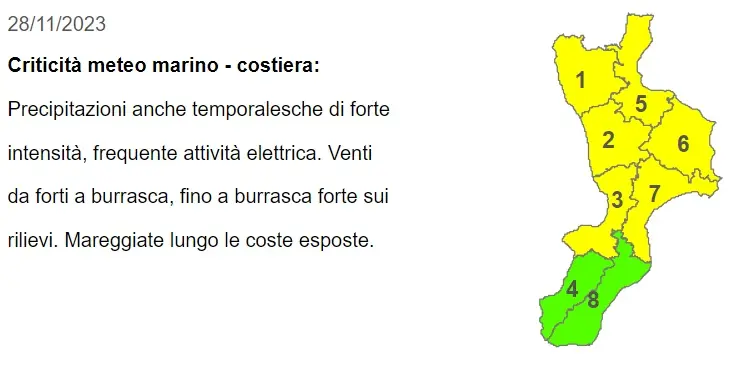Un sistema perturbato di origine atlantica raggiungendo, nel corso delle prossime, ore il Mar Mediterraneo centrale, porterà nuovo impulso perturbato con precipitazioni, anche temporalesche, nelle regioni centro-meridionali specie a ridosso delle aree tirreniche meridionali. Atteso, inoltre, un generale rinforzo della ventilazione, dai quadranti settentrionali sulle regioni alpine e da quelli occidentali sul gran parte del centro-sud. Il Dipartimento della Protezione Civile ha quindi emesso un avviso di allerta gialla per la giornata di domani, martedì 28 novembre, per nove regioni: su parte di Toscana, Umbria, Lazio, Abruzzo e Molise, sull’intero territorio della Campania, su settori di Basilicata, Calabria e Sicilia. Si prevedono dalla sera di oggi, 27 novembre, precipitazioni da sparse a diffuse, anche temporalesche, dapprima sulla Campania. In estensione, nel corso della notte, a Basilicata e Calabria, specie sui settori tirrenici. I fenomeni saranno accompagnati da rovesci di forte intensità, frequente attività elettrica e forti raffiche di vento. Attesi, inoltre, dalle prime ore di domani, 28 novembre, venti occidentali, da forti a burrasca su Toscana, in particolar modo sui settori costieri, Lazio, specie settori montuosi e costieri, Abruzzo, Molise, Campania, Basilicata, Puglia, Calabria e Sicilia, specie sui settori settentrionali. Forti mareggiate slungo le coste esposte e rinforzi di vento fino a burrasca forte sui rilievi delle regioni citate. (Ansa)