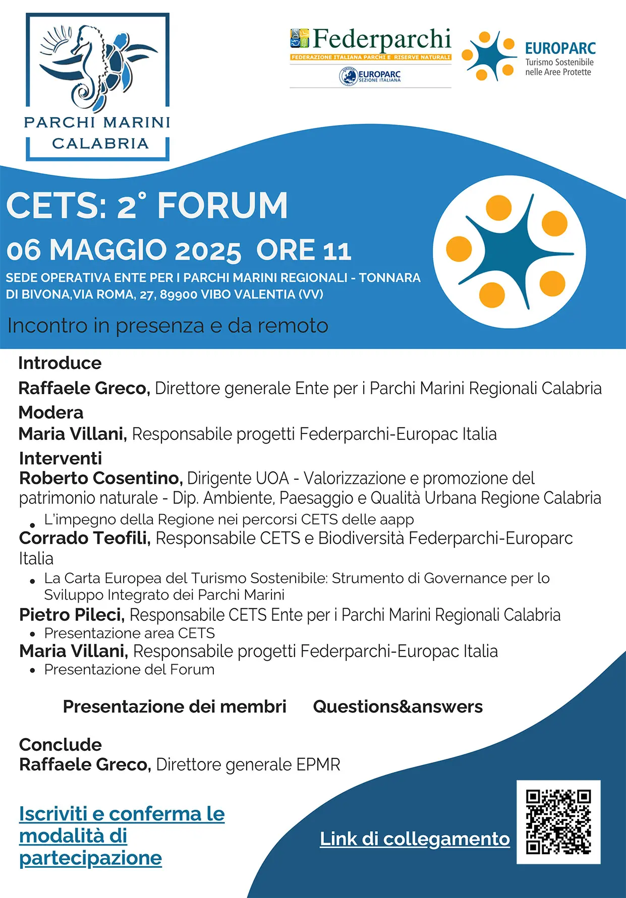 L’evento sarà introdotto dal direttore generale dell’Ente parchi marini regionali, Raffaele Greco, a cui seguiranno gli interventi di: Roberto Cosentino, dirigente valorizzazione e promozione naturale del Dipartimento ambiente della Regione Calabria, Corrado Teofili, responsabile Cets e biodiversità di Federparchi, Pietro Pileci, responsabile Cets dell’Ente ed a presentare il forum sarà Maria Villani, responsabile progetti Federparchi. A chiudere l’incontro, infine, saranno le conclusioni del direttore Greco. Partecipare al forum è ancora possibile e l’iscrizione può essere effettuata attraverso questo link.