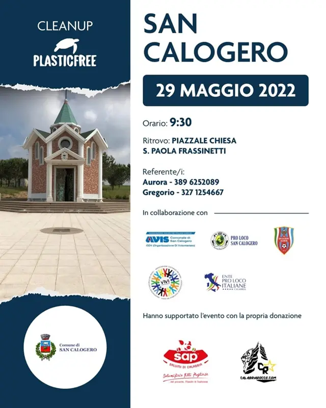 Domenica 29 maggio l’esercito blu di Plastic Free farà tappa per la prima volta nel comune di San Calogero. Lo fa sapere, non senza un pizzico di orgoglio, il referente di zona Gregorio Sposaro, il quale si dice molto entusiasta per la realizzazione dell’evento nel proprio paese: «Invito i sancalogeresi a partecipare in massa all’iniziativa, in maniera tale da interessare nell’operazione di pulizia dai rifiuti plastici e non un’area di territorio più ampia possibile».