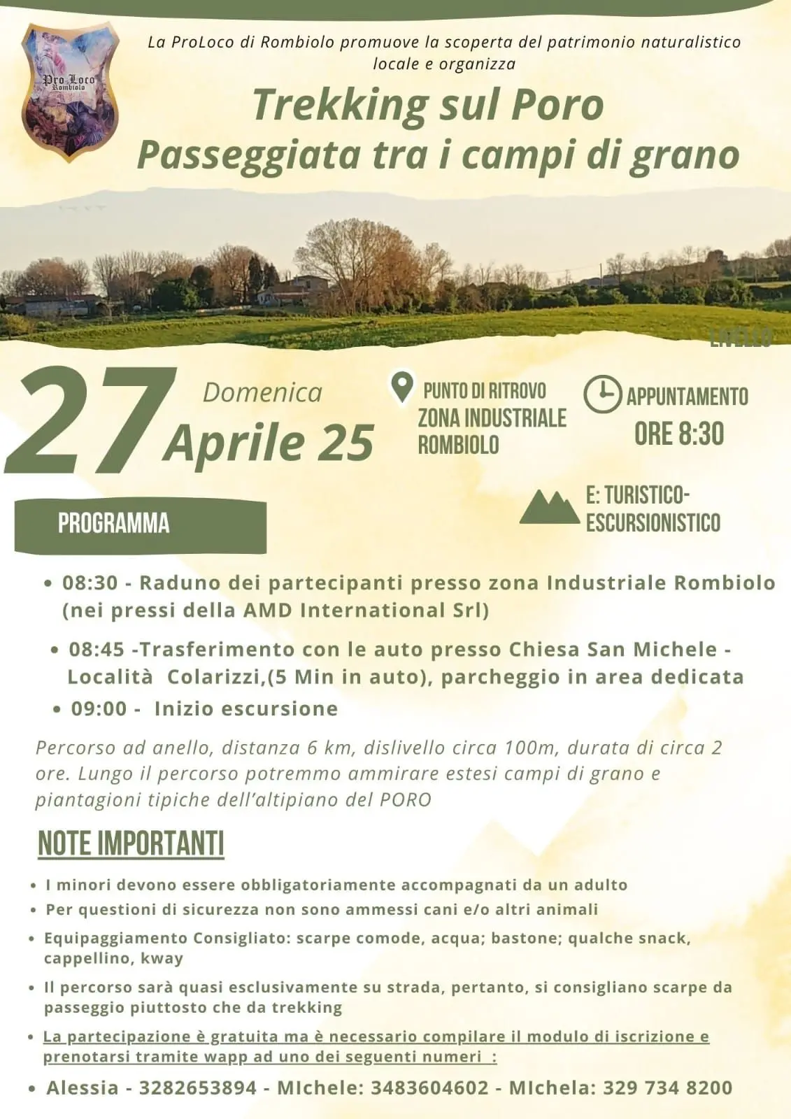 Tra l’altro, in piena sintonia con gli obiettivi prefissati dalla stessa presidente della locale Pro Loco, Alessia Gerace, e dai suoi più stretti collaboratori, che sono proprio quelli di promuovere il turismo lento e sostenibile, offrendo esperienze autentiche di immersione nella natura, a misura d’uomo e lontane dal ritmo fenetico che contraddistingue al mondo d’oggi la vita di tutti i giorni. Il percorso “Trekking sul Poro. Passeggiata tra i campi di grano” è caratterizzato da un dislivello complessivo di circa 100 metri.