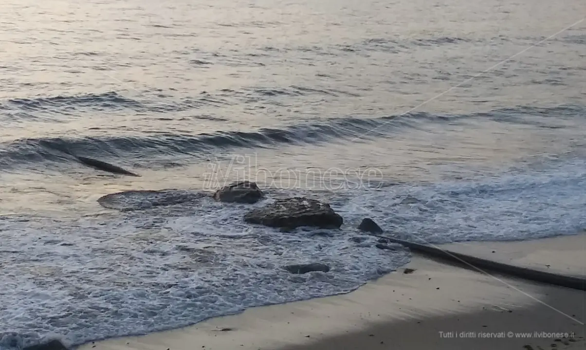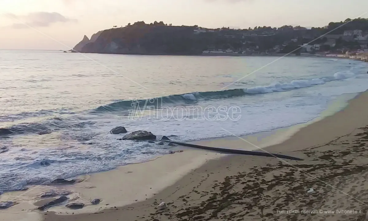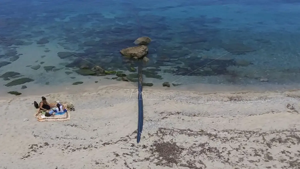 La vista che spazia dall’Aspromonte allo Stretto di Messina, fino alla punta di Capo Vaticano. All’orizzonte la Sicilia, l’Etna e le isole Eolie. La sabbia fine e bianca, l’acqua che va dal turchese al blu. A rovinare tanta bellezza però – sulla spiaggia di Santa Maria di Ricadi in località Fortino – ancora lui, di nuovo a galla: il tubo della condotta del depuratore. [Continua in basso]