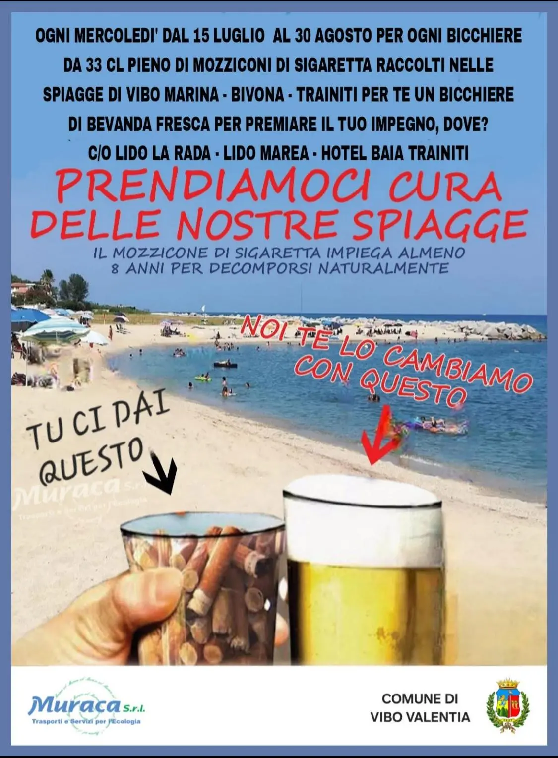 «Torna anche quest’anno l’iniziativa ambientale sulle spiagge della costa di Vibo Valentia, promossa dall’assessorato all’Ambiente e dalla ditta Muraca srl». A comunicarlo è il Comune di Vibo Valentia attraverso un comunicato stampa. L’attività, «intitolata “Prendiamoci cura delle nostre spiagge” – prosegue la nota del Comune -, è volta alla tutela delle coste e alla sensibilizzazione di cittadini e visitatori sui comportamenti responsabili. Dal 16 luglio al 30 agosto, ogni mercoledì, sarà possibile partecipare attivamente a questa azione che coinvolge le spiagge di Vibo Marina, Bivona e Trainiti. I partecipanti che raccoglieranno i mozziconi di sigaretta abbandonati lungo l’arenile e li consegneranno all’interno di un bicchiere, riceveranno in cambio una bevanda fresca offerta dagli stabilimenti aderenti: lido “La Rada”, lido “Marea, hotel Baia Trainiti”.