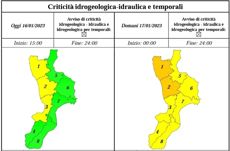 Nuova ondata di freddo e maltempo alle porte per tutta Italia ed anche per la Calabria. Il tutto per gli effetti di una vasta area di bassa pressione di origine nord-atlantica, già responsabile di un generale peggioramento delle condizioni meteorologiche, con precipitazioni anche temporalesche su gran parte del Centro-Sud, associate ad intensa ventilazione e locali nevicate sino a quote collinari sulle regioni del Nord. ll Dipartimento della Protezione Civile ha emesso un ulteriore avviso di condizioni meteorologiche avverse che integra ed estende quello diffuso ieri. L’avviso prevede dalla sera di oggi, lunedì 16 gennaio, precipitazioni sparse, a prevalente carattere di rovescio o temporale, su Sardegna, Toscana, Umbria, Lazio, settori centro-occidentali di Marche, Abruzzo, Molise, Puglia, su Campania e Basilicata e sulla Calabria, specialmente sui settori settentrionali. I fenomeni saranno accompagnati da rovesci di forte intensità, frequente attività elettrica e forti raffiche di vento. Si segnala, inoltre, il persistere di venti da forti a burrasca, dai quadranti occidentali, su Sardegna, Campania, Basilicata, Calabria e Sicilia, con rinforzi fino a burrasca forte lungo i rilievi montuosi e localmente sui settori litoranei e forti mareggiate lungo le coste esposte. Dal mattino di domani, martedì 17 gennaio, infine, si prevedono nevicate a quote al di sopra dei 300-500 metri, su Lombardia, Veneto ed Emilia-Romagna occidentale, con locali sconfinamenti fino a quote di pianura e con apporti al suolo generalmente deboli, localmente moderati a quote superiori. ߐ stata valutata per domani, martedì 17 gennaio, allerta arancione in Campania, Calabria nord-occidentale, buona parte del Molise e Basilicata sud-occidentale. Allerta gialla su Toscana, Umbria, Lazio, Sardegna occidentale, e settori di Calabria, Abruzzo, Basilicata, Marche, Molise e Puglia.
