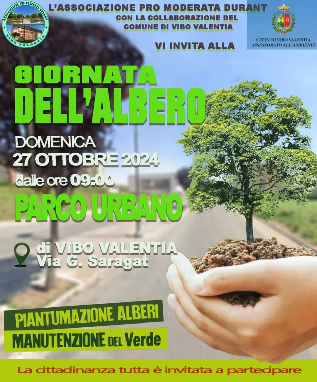 Domenica 27 ottobre a partire dalle ore 9 lungo il viale Giuseppe Saragat e in via Moderata Durant, l’associazione neonata Pro Moderata Durant darà vita alla sua prima iniziativa ufficiale con la piantumazione di dieci nuovi alberi. L’evento, organizzato interamente dall’associazione, con la collaborazione del settore Ambiente dell’amministrazione di Vibo Valentia, si avvale del supporto dell’azienda Calabria Verde. I volontari si ritroveranno lungo il viale Saragat per iniziare la piantumazione. «Le operazioni – hanno fatto sapere gli organizzatori – saranno effettuate, si spera, con l’ausilio dei bambini che vorranno intervenire alla manifestazione».