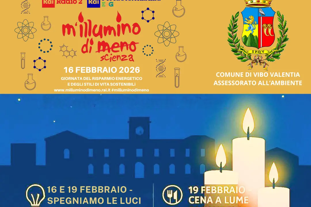 Anche quest’anno il Comune di Vibo Valentia partecipa alla campagna nazionale di sensibilizzazione “M’illumino di meno”, promossa da Rai Radio 2 e dedicata al risparmio energetico e agli stili di vita sostenibili. L’appuntamento è fissato per il 16 febbraio 2026, giornata simbolica in cui cittadini, enti e istituzioni di tutta Italia saranno invitati a compiere un gesto concreto per la tutela del pianeta. I dettagli sono contenuti in una nota del Comune.