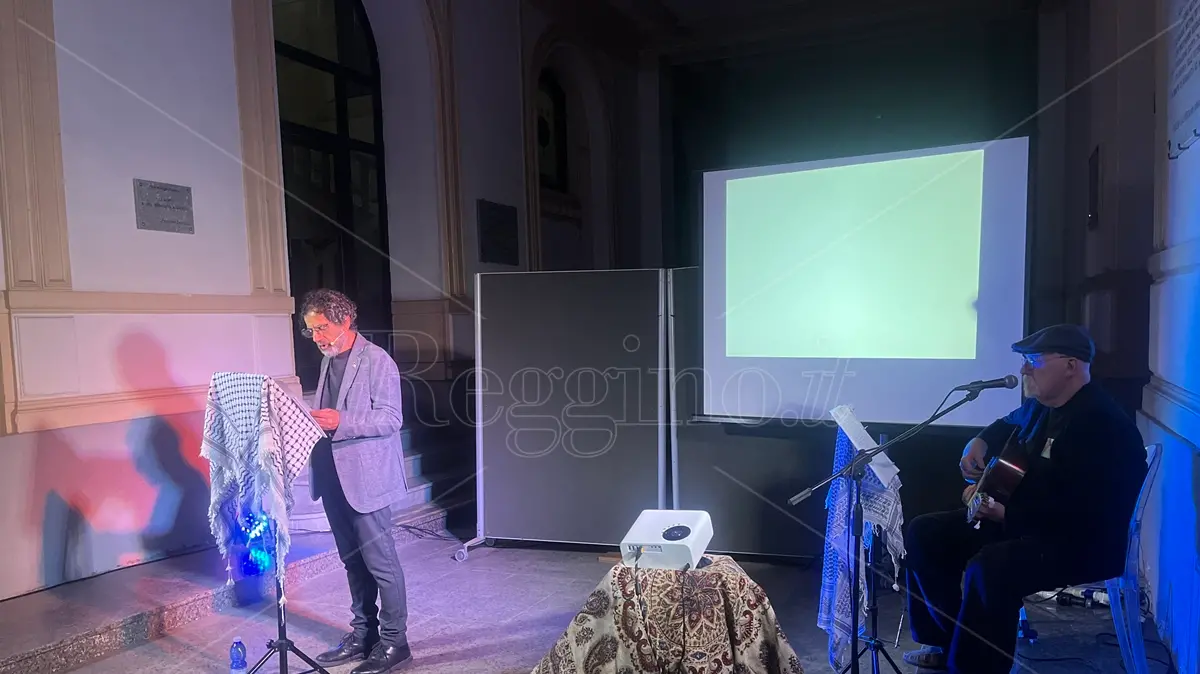 Gaza è porta dell'universo per i vivi. In questo tempo amaro vive come la cenere dei suoi uccisi e rinasce come loro rinascono». Declama, accompagnato dal musicista Massimo Mollo, i versi del poeta palestinese Ibrahim Nasrallah, l’attore a attivista palestinese, residente ormai da tempo a Napoli, Omar Suleiman. Così nella galleria di palazzo San Giorgio a Reggio Calabria si leva la voce di “Maria di Gaza”, donna e madre (titolo della raccolta poetica alla quale di ispira il reading) che incarna il dolore e la speranza al tempo (lungo) del genocidio del popolo palestinese.