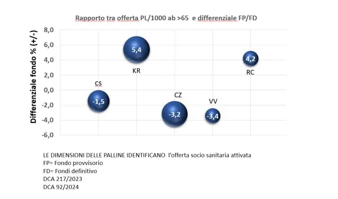 Studiando bene questo grafico, Il territorio vibonese, che presenta la minore offerta di posti letto (LEPS) territoriali, subisce il maggiore taglio; di contro Crotone, che ha la maggiore offerta (migliori LEPS), ha il maggior incremento del fondo; di converso, in termini di LEA, su Vibo, che presenta minori Prestazioni territoriali, viene eseguito il maggiore taglio, conferendo un fondo che non copre nemmeno i letti accreditati, mentre a Crotone, che ha la più alta offerta di Prestazioni territoriali, viene attribuito il maggior incremento del fondo: esempio concreto di autonomia differenziata: chi ha più, avrà di più; chi ha meno, avrà di meno.
