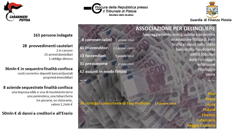 C’è anche un vibonese fra gli arrestati delle operazioni “Pluribus” e “Amici Nostri” del Comando provinciale carabinieri di Pistoia e del Comando provinciale della Guardia di Finanza di Pistoia contro un’associazione a delinquere finalizzata all’intestazione fittizia di beni, auto-riciclaggio, bancarotta fraudolenta, usura, estorsione, assunzioni fittizie finalizzate alle truffe in danno dello Stato, favoreggiamento dell’immigrazione clandestina, evasione d’imposta e false fatturazioni.Due dei destinatari delle misure sono stati trasferiti in carcere, venticinque agli arresti domiciliari e uno è stato sottoposto all’obbligo di dimora. Eseguite anche 41 perquisizioni locali e domiciliari, finalizzate alla ricerca di materiale informatico e cartaceo, idoneo a corroborare ulteriormente le ipotesi accusatorie. Due indagini distinte, convenzionalmente denominate “Amici Nostri” ex “Pluribus” sono confluite in un unico procedimento penale nel cui ambito hanno svolto sinergiche investigazioni il Nucleo Investigativo del Reparto Operativo del Comando Provinciale Carabinieri e il Nucleo di Polizia Economico-Finanziaria della Guardia di Finanza di Pistoia, denunciando complessivamente 163 persone. I carabinieri hanno avviato le indagini nell’aprile del 2015, concentrando la loro attenzione sull’operato di alcuni commercialisti della Provincia e sugli imprenditori a loro collegati mentre le Fiamme Gialle, dal gennaio dello scorso anno, hanno svolto mirati accertamenti di polizia economico-finanziaria sul loro conto. Le imprese coinvolte venivano fraudolentemente “svuotate” delle proprie risorse aziendali, attraverso il depauperamento dell’attivo, determinandone l’insolvenza ed, in alcuni casi, il fallimento. Inoltre nel corso delle indagini è stato accertato che quanto fraudolentemente distratto veniva illecitamente reimpiegato/riciclato in nuove realtà imprenditoriali che, di fatto, subentravano alle imprese fallite o insolventi e ne proseguivano l’attività, anche attraverso “prestanome”. Fra gli indagati finito agli arresti domiciliari anche Franco Papuzzo, 67 anni, di Vibo Valentia, ma da qualche anno domiciliato a Montecatini. Coinvolto nel 2007 nell’operazione “Nuova Alba” contro il clan Lo Bianco di Vibo Valentia, Franco Papuzzo dopo una condanna in primo e secondo grado è stato assolto in Cassazione.
