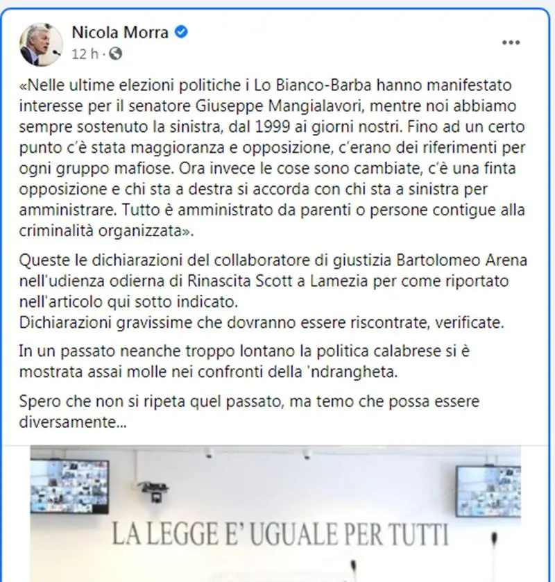 Interviene anche il presidente della Commissione parlamentare antimafia, Nicola Morra, sulle dichiarazioni del collaboratore di giustizia Bartolomeo Arena che nel corso del maxiprocesso Rinascita Scott ha chiamato in causa i senatori vibonesi Giuseppe Mangialavori (Forza Italia) e Franco Bevilacqua (“Cambiamo”, ex An) quali destinatari dei voti dei clan Lo Bianco-Barba e Pardea-Macrì di Vibo. Lo fa attraverso una dichiarazione sul proprio profilo facebook nella quale Nicola Morra parte riportando le parole pronunciate in aula dal collaboratore: «Nelle ultime elezioni politiche i Lo Bianco-Barba hanno manifestato interesse per il senatore Giuseppe Mangialavori, mentre noi abbiamo sempre sostenuto la sinistra, dal 1999 ai giorni nostri. Fino ad un certo punto c’è stata maggioranza e opposizione, c’erano dei riferimenti per ogni gruppo mafioso. Ora invece le cose sono cambiate, c’è una finta opposizione e chi sta a destra si accorda con chi sta a sinistra per amministrare. Tutto è amministrato da parenti o persone contigue alla criminalità organizzata».