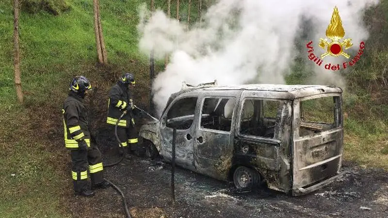 Il mezzo ritrovato dai Vigili del fuoco in una stradina di campagna nei pressi del campo sportivo comunale. Quasi certamente dolose le cause del rogo