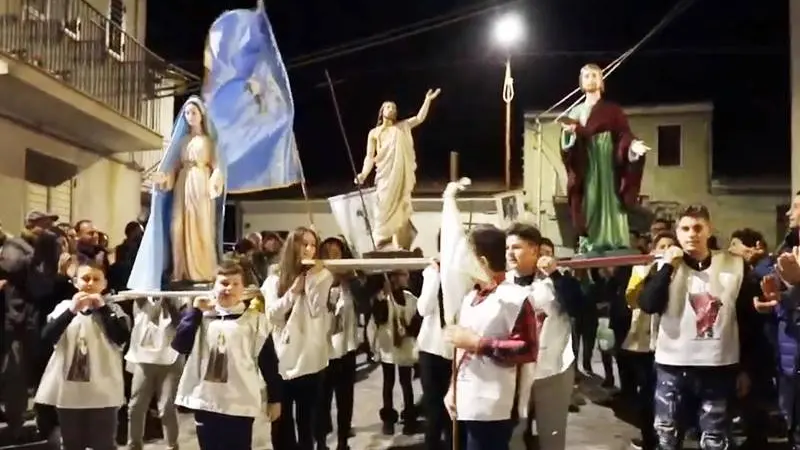 La loro iniziativa, raccontata da Saverio Caracciolo nella trasmissione LaC Storie su LaC Tv, lo ha colpito al tal punto da decidere di regalare a quei ragazzi, pieni di entusiasmo e passione, una piccola grande gioia. Del resto quelle sagome di compensato raffiguranti San Giovanni, la Vergine e il Cristo risorto, che i bambini di Sant’Angelo di Gerocarne utilizzavano per mettere in scena l’Affruntata emulando le gesta dei grandi, lui, don Luigi Scordamaglia, poteva far in modo di rimpiazzarle con delle effigi più realistiche. Appassionato di scultura, non ci ha pensato due volte e ha deciso che quei ragazzi meritavano di portare in spalla delle autentiche statue, naturalmente realizzare su misura per loro. «La vista di quei bambini mi ha emozionato – ha detto il parroco di Potenzoni – e ho pensato di realizzare per loro delle statue». Un dono molto apprezzato dai piccoli portantini di Sant’Angelo, in particolare da Michele La Rocca, promotore dell’idea dell’“Affruntata dei piccoli” che, insieme ai suoi compagni, ha condotto le statue in chiesa per la benedizione impartita da don Benedetto Nicotera. Dopo la celebrazione, non potevano mancare le “prove ufficiali” dell’Affruntata con le nuove statue, messa in atto davanti alla chiesa matrice di Sant’Angelo tra la curiosità dei presenti con tanto di spettacolo pirotecnico finale. Saverio Caracciolo con la sua fedele macchina da presa è tornato a Potenzoni e a Sant’Angelo per documentare questa nuova storia. Guarda il servizio: