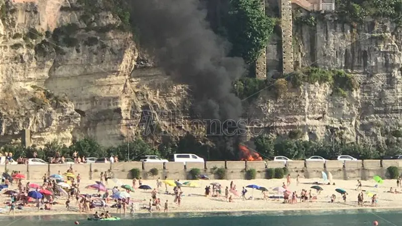 Paura sul lungomare di Tropea nel pomeriggio di oggi per un incendio che ha coinvolto due vetture parcheggiate sulla strada che costeggia la spiaggia più famosa della rinomata località balneare, quella del Mare piccolo, affollatissima per la prima vera domenica d’estate che ha richiamato sulla battigia centinaia di bagnanti. Il rogo, le cui cause sono in corso di accertamento, ha interessato una prima auto per poi attingerne una seconda che si trovava parcheggiata nelle immediate vicinanze. Allertati dai tanti presenti, sul posto si sono precipitati i Vigili del fuoco del comando provinciale di Vibo Valentia che hanno provveduto ad estinguere le fiamme senza riuscire tuttavia ad evitare che almeno una delle due auto venisse completamente distrutta dal rogo. L’episodio ha destato comprensibile preoccupazione tra i tanti bagnanti che, come detto, affollavano la spiaggia e richiamato sul posto numerosi curiosi. Una densa colonna di fumo si è inoltre alzata dal luogo del rogo invadendo le vie della sovrastante rupe mentre alcune esplosioni, probabilmente dovute allo scoppio degli pneumatici, hanno creato ulteriore panico. Accertamenti sono in corso, anche da parte dei carabinieri sopraggiunti sul posto, per stabilire le esatte cause dell’incendio.