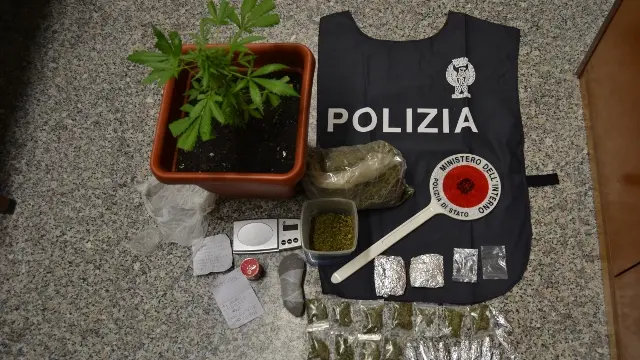 Nel corso della perquisizione, condotta con l’ausilio di due unità cinofile antidroga della Polizia di Stato, è stato rinvenuto un totale di circa 600 grammi di marijuana in parte già suddivisa in dosi e pronta per la cessione, una pianta di canapa indiana, un bilancino di precisione, materiale vario per il confezionamento delle dosi, un biglietto manoscritto con nomi e cifre nonché banconote per un totale di 360 euro, occultate in una tazza.