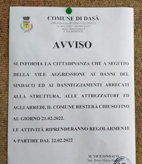 Intanto Raffaele Scaturchio ha trascorso la notte sotto osservazione nel reparto di Medicina dell’ospedale Jazzolino di Vibo Valentia. In mattinata le dimissioni con una prognosi di venti giorni. Intanto, il municipio di Dasà resterà chiuso fino a lunedì 21, a causa dei danno arrecati a struttura, arredi e attrezzature.