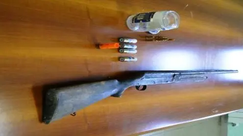 Un fucile automatico calibro 12 con matricola abrasa, diverse cartucce per fucile dello stesso calibro e cartucce da guerra per pistola.