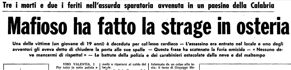 Il 10 marzo 1989 a Briatico rimane ucciso in un agguato Italo Greco. Aveva 53 anni quando è stato eliminato, ma era già un nome di peso nella malavita locale. L’1 marzo 1971 a Capistrano l’allora 35enne di Briatico Italo Greco aveva infatti ucciso tre persone in un’osteria ferendone altre due sol perché una delle vittime gli aveva ingiunto di chiudere la porta del locale – un’osteria – essendoci fuori la neve. A terra restarono un 32enne e un 40enne, mentre un ragazzo di 19 anni morì per un collasso causato dallo spavento dopo i primi colpi d’arma da fuoco esplosi all’impazzata da Italo Greco che verrà arrestato e successivamente condannato per triplice omicidio.