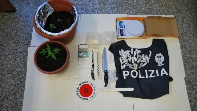 Durante la stessa perquisizione il personale ha rinvenuto 40 involucri in cellophane contenenti marijuana, per complessivi 50 grammi circa, confezionati e pronti allo smercio, nonché due vasi dove erano innestate tre piante di cannabis indica, circa 50 semi della medesima pianta, un bilancino elettronico di precisione, un coltello da cucina intriso di presumibilmente di hashish e materiale vario per il confezionamento di altre dosi.