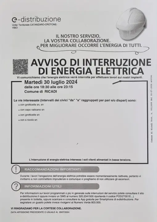 Continuano i disagi per la popolazione di Ricadi e le strutture ricettive presenti sul territorio comunale, interessato da tre giorni da un vasto black-out elettrico. Il distributore nazionale di corrente elettrica, stamane ha emanato un avviso di interruzione del servizio per oggi dalle ore 18:30 fino alle ore 23:15 per le località di Grotticelle, Capo Vaticano e la frazione di San Nicolò dove, nuovamente nella giornata di ieri, le sbarre del passaggio a livello sono rimaste parzialmente alzate. Per garantire massimi livelli di sicurezza stradale e pedonale, sul posto ieri si sono recati una pattuglia dei carabinieri ed una squadra di Vigili del fuco per eseguire alcuni interventi manuali sull’intersezione. Le squadre dei tecnici, mandate sul posto da ieri dal distributore nazionale del servizio, sono al lavoro per individuare i guasti causati ai cavi interrati.