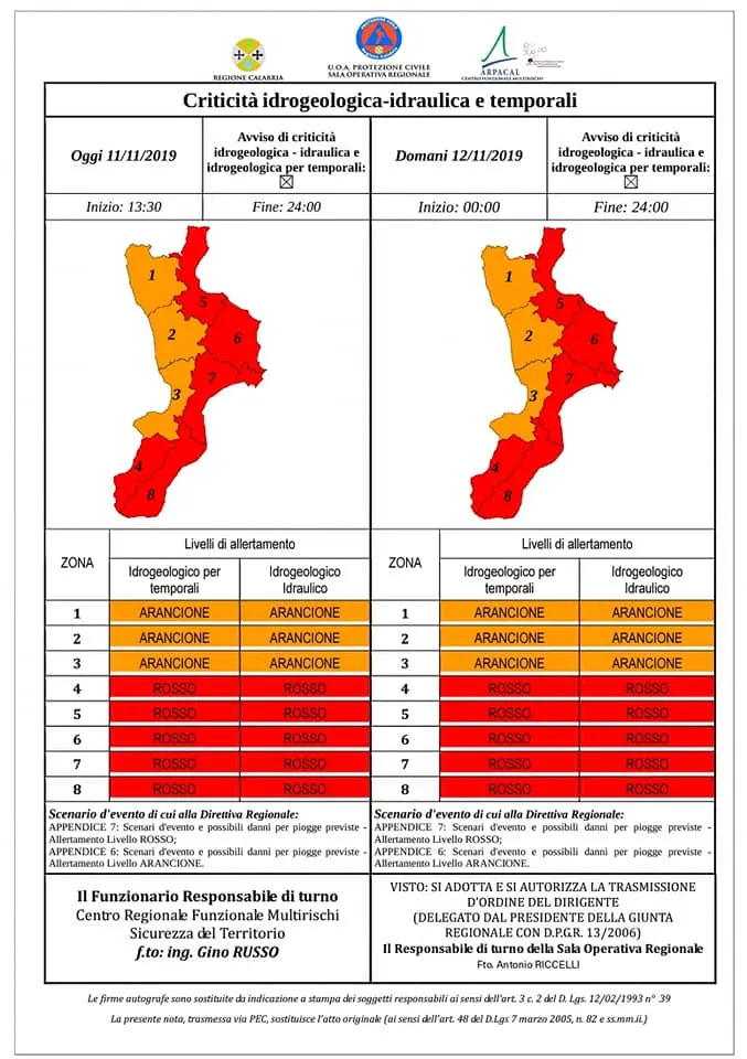 Alla luce dell’allerta meteo diramata da Protezione civile e Arpacal per le giornate di oggi e domani 12 novembre, in alcuni casi con codice arancione (Cala 3) ed in altri rosso (Cala 8), alcuni Comuni del Vibonese, compreso il capoluogo, hanno disposto la chiusura delle scuole di ogni ordine e grado sui rispettivi territori. Nello specifico, risultano emesse le ordinanze nei Comuni di Vibo Valentia, Pizzo, Mileto, Nicotera, Cessaniti, Rombiolo, Francavilla Angitola, Simbario, Stefanaconi, Capistrano, Fabrizia e Serra San Bruno, in quest’ultimo caso la chiusura è stata disposta anche per il giorno seguente, mercoledì 13 novembre. I provvedimenti sono stati adottati dai sindaci in questione a titolo precauzionale rispetto alle previsioni meteo che parlano di rovesci a carattere temporalesco e forte attività elettrica.