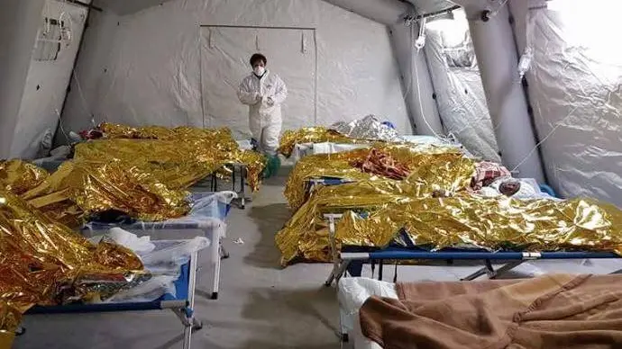 Ventidue profughi sono tenuti sotto osservazione per alcune ore nelle tende da campo, allestite sulla banchina del porto dalle strutture mediche e dalle organizzazioni che hanno curato l’accoglienza, per ulteriori accertamenti sanitari. (Ansa)