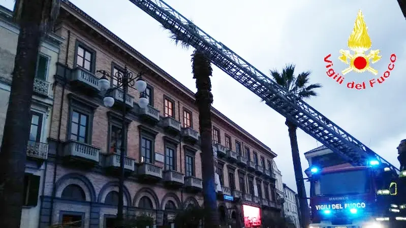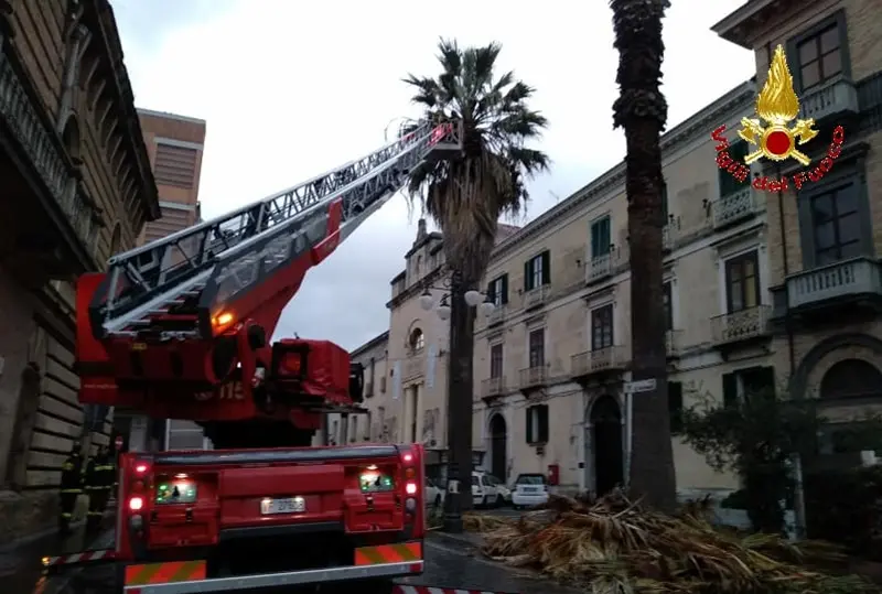 Intervento dei vigili del fuoco del comando provinciale di Vibo Valentia in piazza Garibaldi, in prossimità di Palazzo Gagliardi, a seguito della caduta di alcuni rami dagli alberi di palma andati a finire su alcune autovetture in sosta.