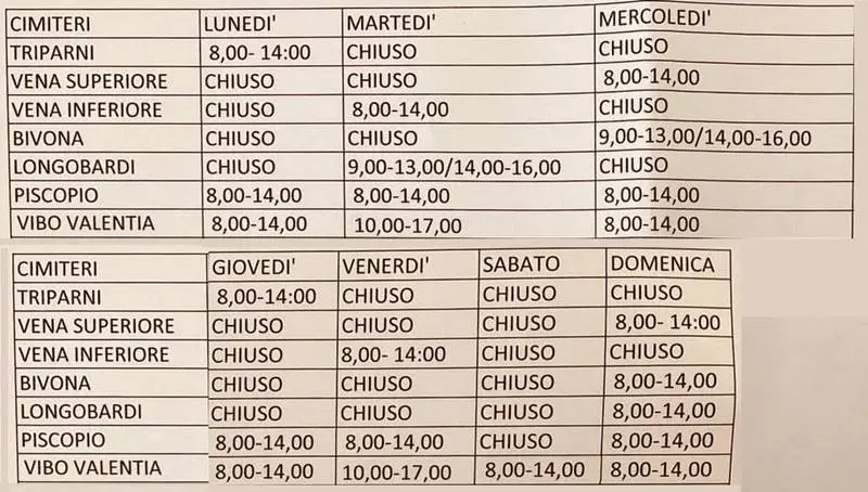 Di seguito gli orari dettagliati dell’apertura dei cimiteri della città: