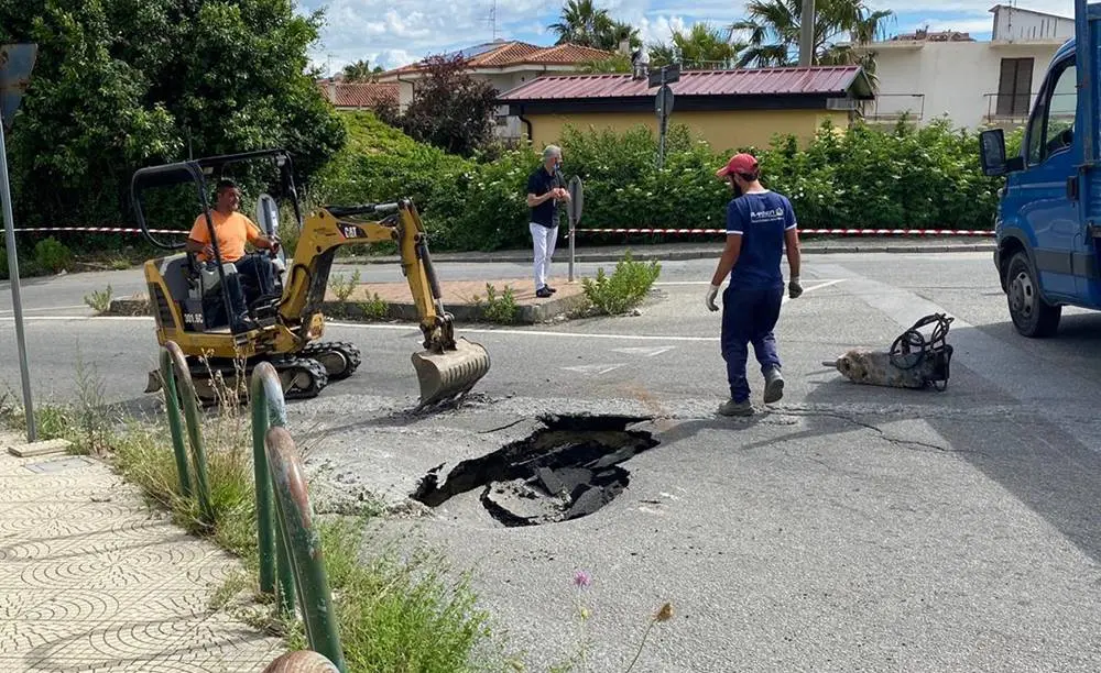 Aggiornamento ore 16. Il Comune ha predisposto l’intervento di riparazione del manto stradale e alcuni operai sono al lavoro per consentire la riapertura al traffico dell’arteria stradale interessata dal cedimento.