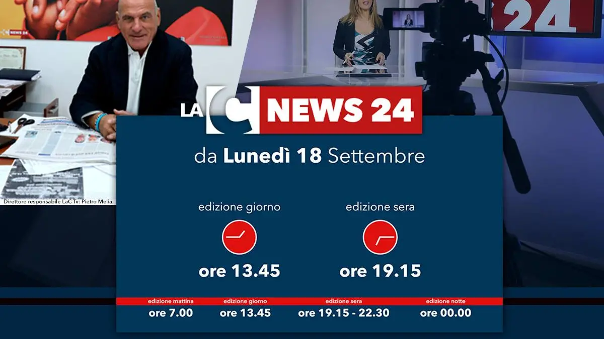 Cambia orario il Telegiornale di La C news 24. L’edizione del giorno, dopo il primo appuntamento fissato alle 7 del mattino, avrà la principale “finestra” informativa alle 13.45 e non più alle ore 14.00. Quindi L’edizione della sera è fissata per le ore 19.15 e non più alle 19.30.