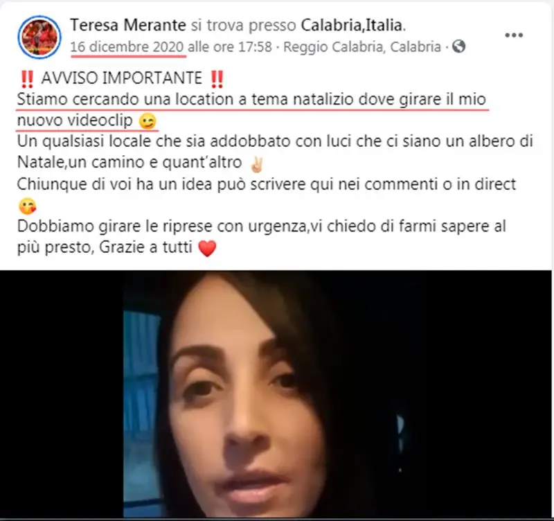 E’ il 16 dicembre 2020 quando alle ore 17.58 Teresa Merante sul proprio profilo facebook pubblica il seguente post: “Avviso Importante. Stiamo cercando una location a tema natalizio dove girare il mio nuovo videoclip. Un qualsiasi locale che sia addobbato con luci che siano un albero di Natale un camino e altro. Chiunque di voi ha un’idea può scrivere qui nei commenti o in direct. Dobbiamo girare le riprese con urgenza”. [Continua dopo la pubblicità]